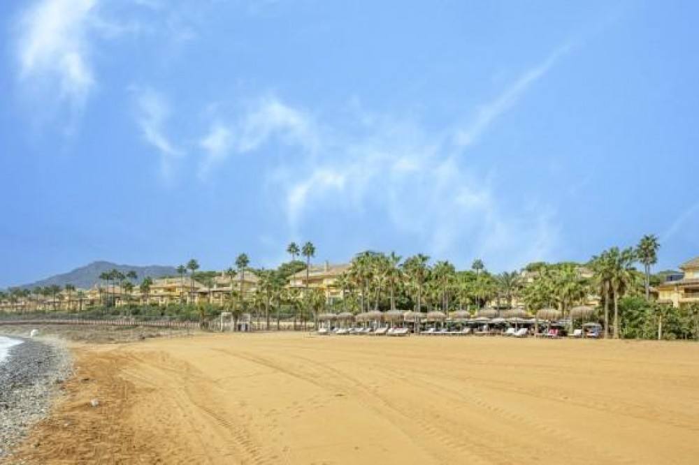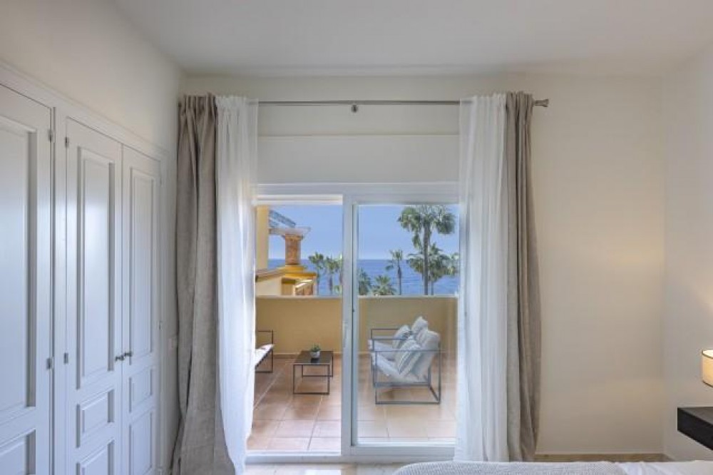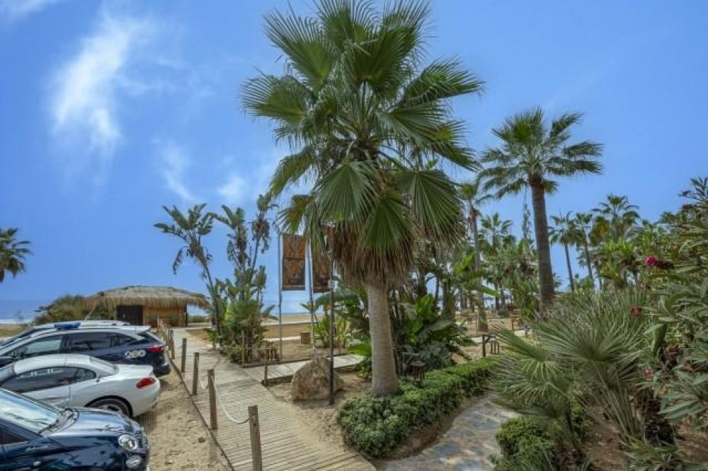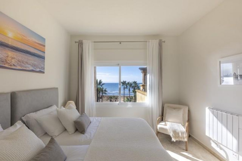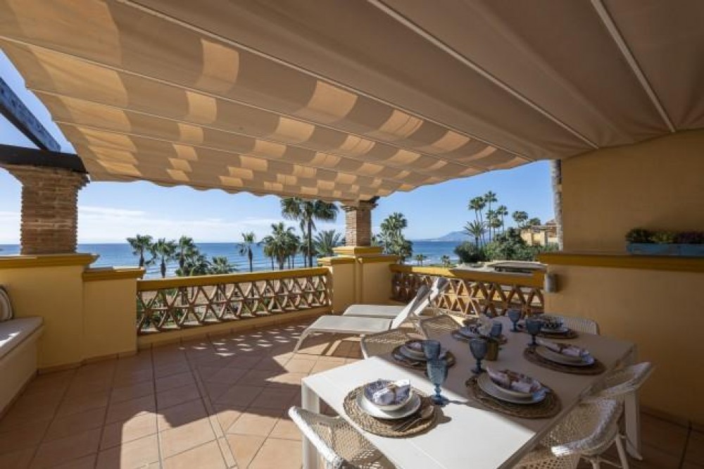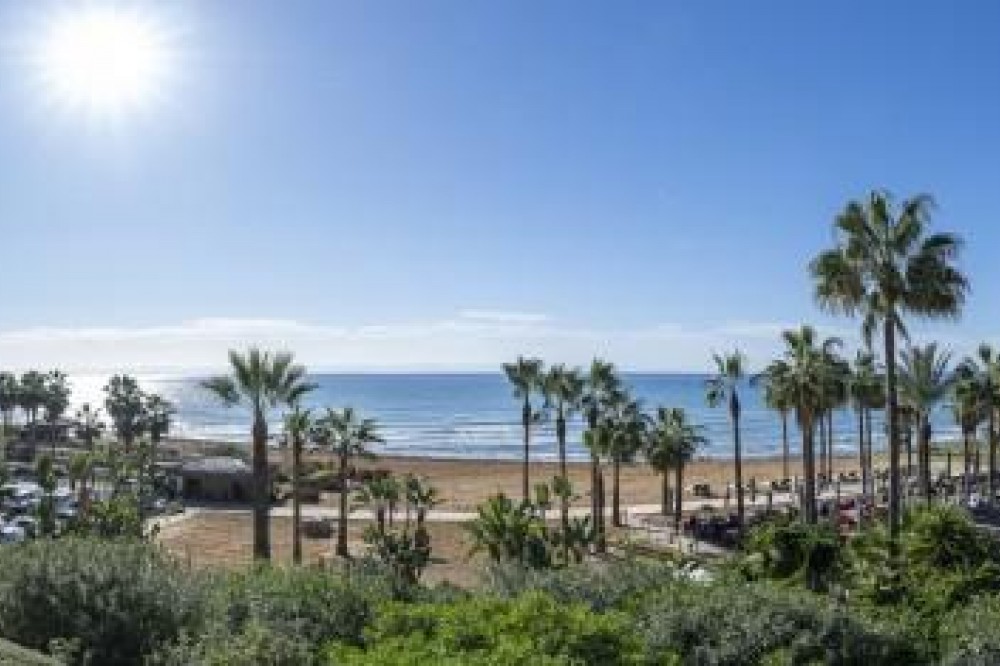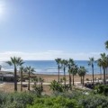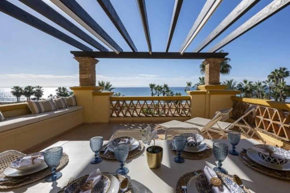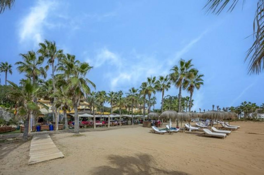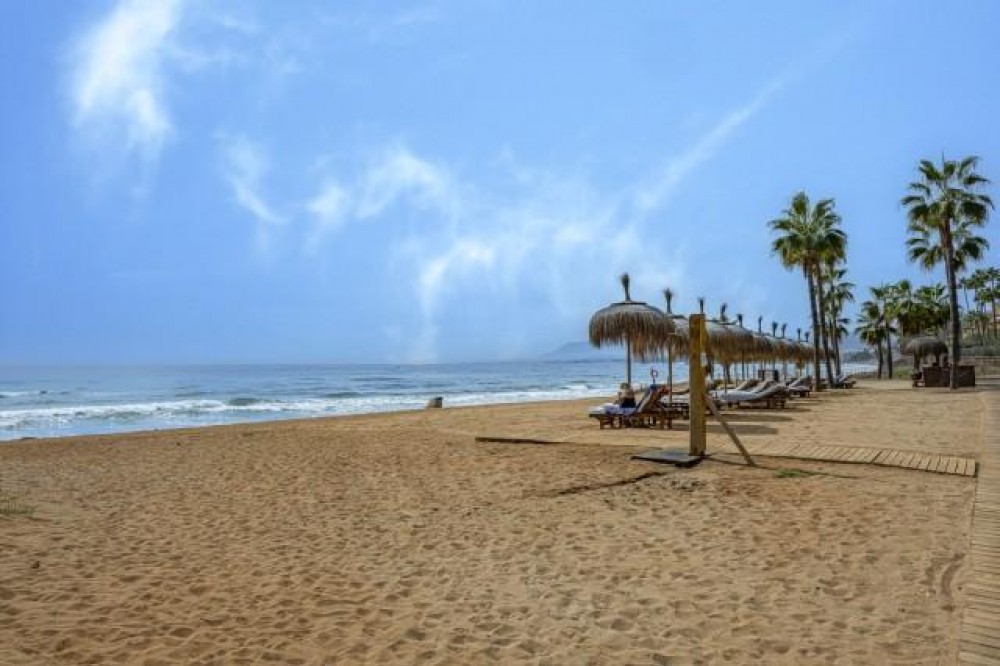 - This stunning 3-bedroom apartment offers breathtaking sea views and is situated in a serene beachfront community, nestled around the prestigious Rio Real Golf Course in East Marbella. Bathed in natural light, the apartment features an inviting entrance hall, a fully equipped kitchen, a spacious living and dining area with panoramic views, three generously sized bedrooms, and three elegant bathrooms. The living area opens onto a fabulous 45 m² southfacing terrace, perfect for al fresco dining and soaking in the Mediterranean ambience. Two of the bedrooms boast direct sea views and en-suite bathrooms, while the third has its own private terrace. The property includes a convenient parking space and two storage rooms. The Rio Real Playa complex is a haven of lush gardens and two communal swimming pools. It is only a 5-minute stroll to the renowned Trocadero Beach Club and within proximity to the Rio Real Hotel & Golf Club and its exclusive amenities. Malaga International Airport is just a 30-minute drive away. The Rio Real Playa community enhances the living experience with two communal pools (one heated) and beautifully maintained garden areas. Courtesy parking for friends and guests is also available. Additional features include air conditioning, electric shutters, built-in wardrobes, a laundry room, double glazing, and a secure gated community. Experience the ultimate in beachfront living with this extraordinary apartment in Marbella East.