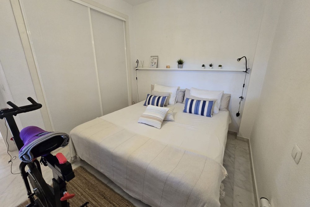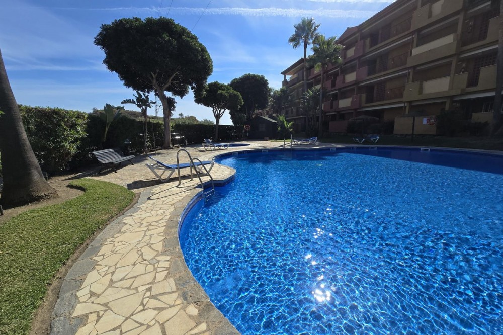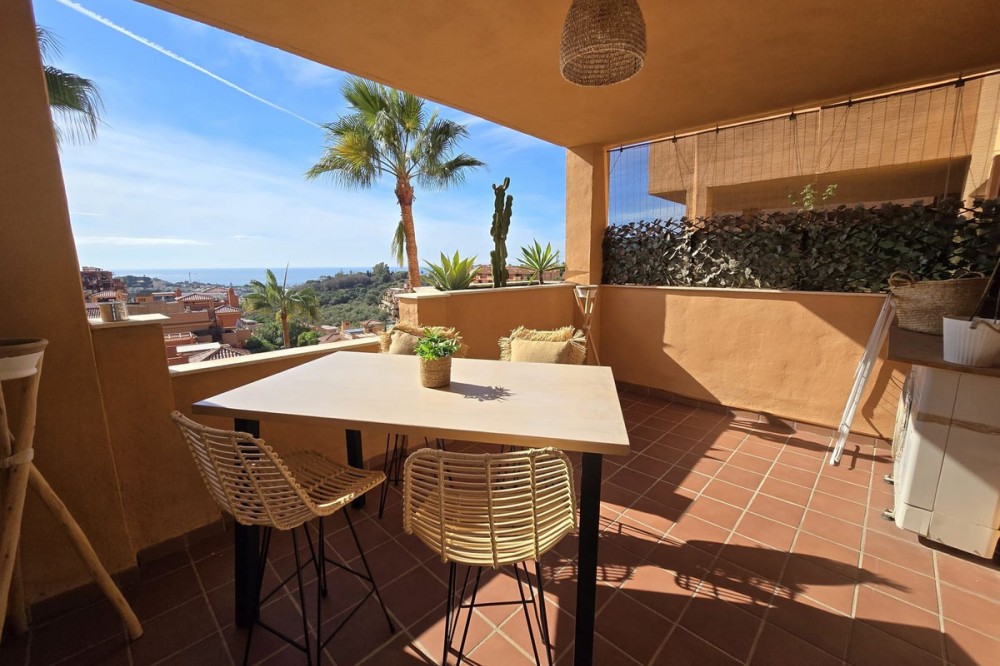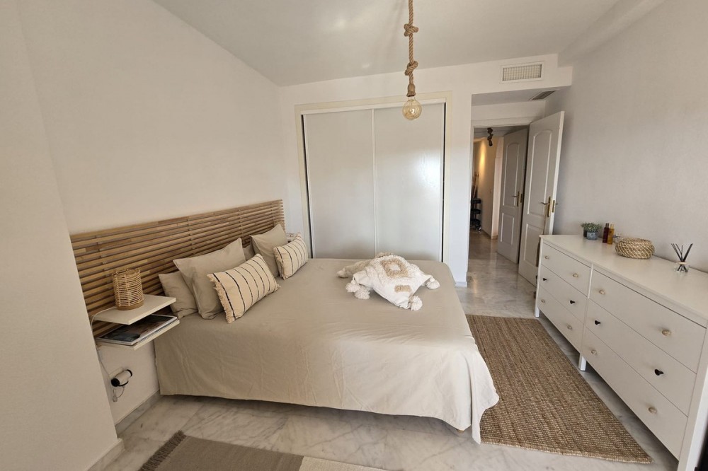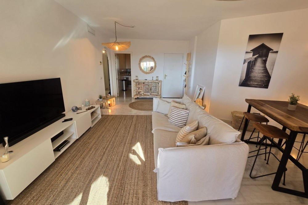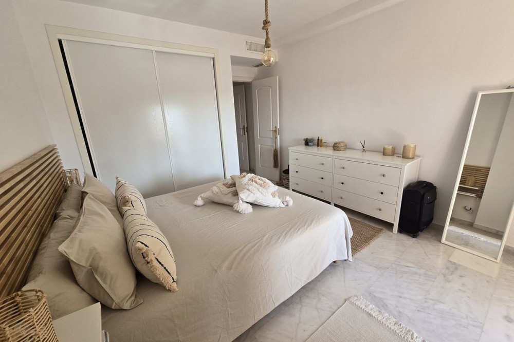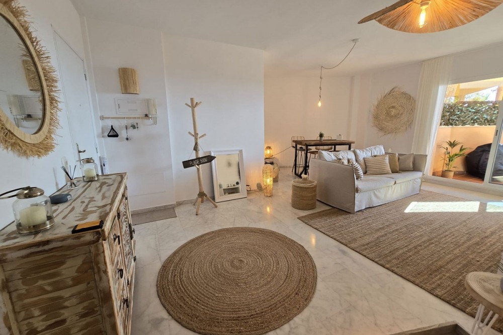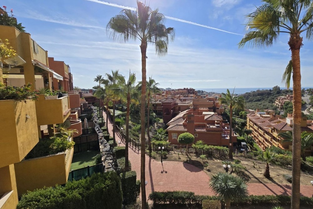 - Charming flat for sale in Reserva de Marbella with sea views, only 15 minutes drive from the centre of Marbella. The flat consists of 2 bedrooms with 2 complete bathrooms, one of them en suite, living-dining room (quite spacious as it is a corner flat), fully fitted kitchen, fitted wardrobes, air conditioning, lift. It is situated in the middle floor with fantastic views to the sea, it has a garage space and storage room. The urbanisation offers communal swimming pool, tropical gardens, security 24h
