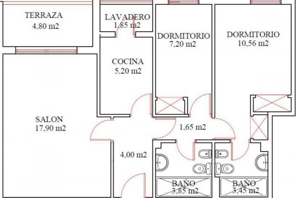 - Second-floor apartment with elevator, two bedrooms, two bathrooms, living/dining room, kitchen, laundry room, and terrace. Private outdoor parking space and storage room.