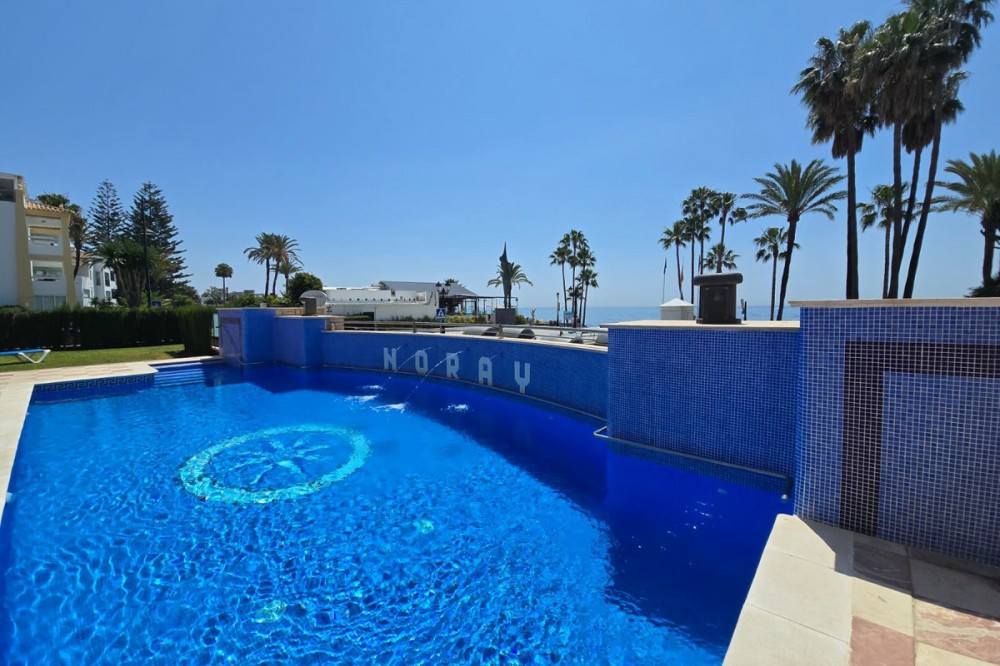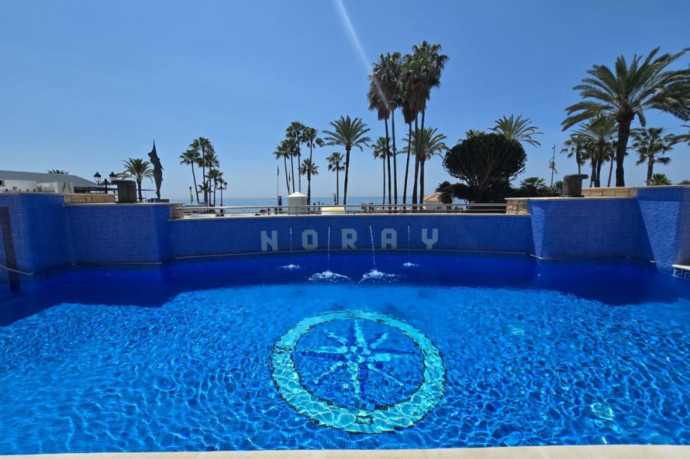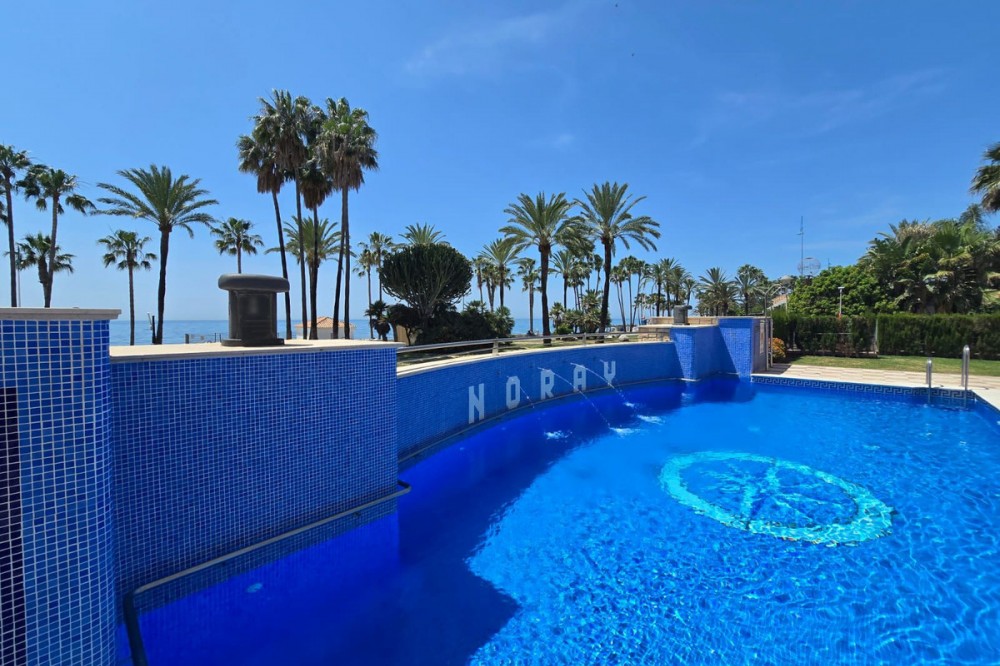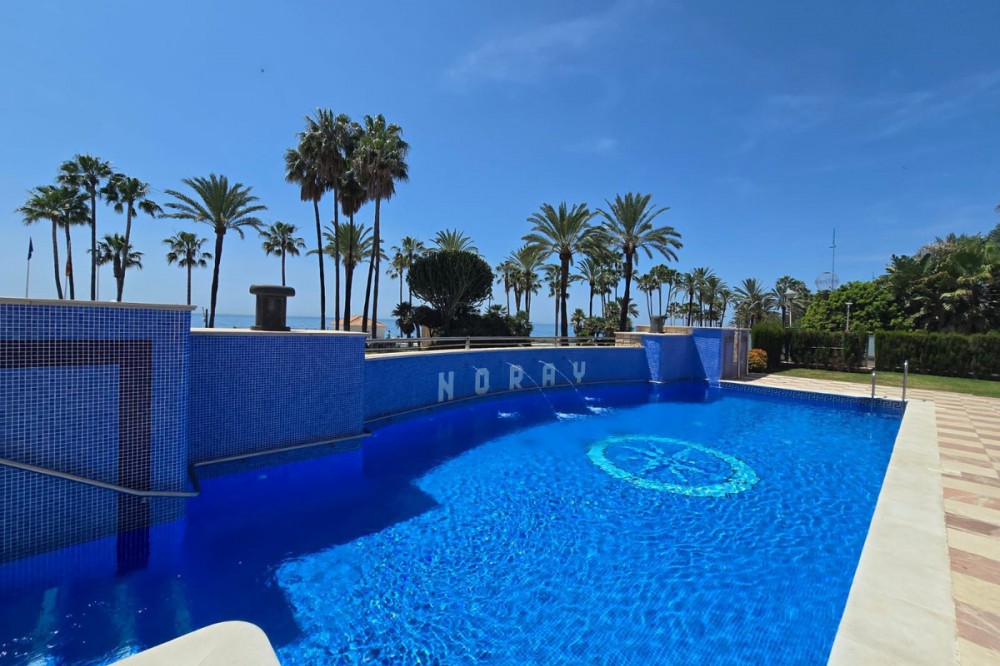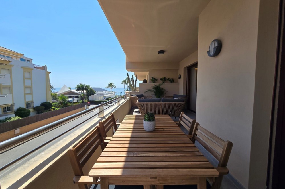 - This luxurious 2 bedroom 2 bathroom apartment located in the prestigious beachfront urbanization in San Pedro has been completely transformed with top-quality renovations, offering a modern and sophisticated living experience. Every aspect of the home has been upgraded, including a brand-new water system and electrical wiring throughout. The kitchen is a chef's dream, featuring sleek, high-end furniture from Germany and the latest Bosch appliances, including a 21-bottle wine cooler, dishwasher for 12, induction cooktop, oven, and microwave. State-of-the-art sensor-activated cabinets add a touch of innovation, while a Philips drinking water filtration system ensures convenience and health. The apartment offers luxurious comfort with heated floors in both bathrooms, and a master switch controls all the lights and outlets, giving you complete control over your space. A central air conditioning system keeps the entire apartment cool, and a built-in safe and digital peephole provide additional security. For ultimate ease, a robotic vacuum cleaner takes care of the floors, and the apartment comes with a two-year warranty on all furniture, appliances, and renovations. This is a rare opportunity to own a fully renovated, high-end property in one of the most sought-after beachfront locations, where modern luxury meets coastal serenity.
