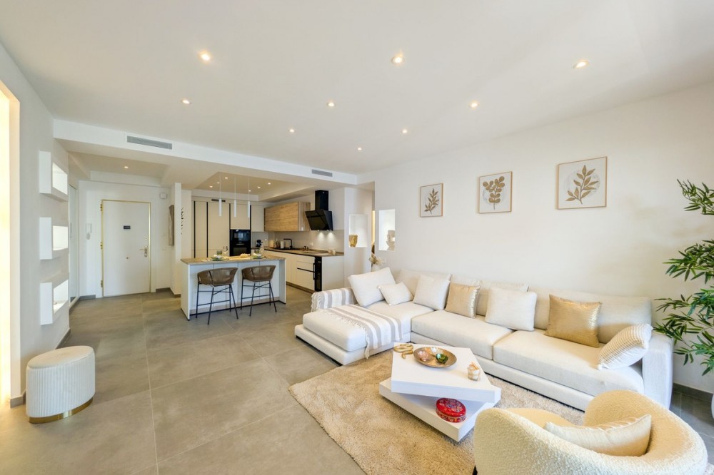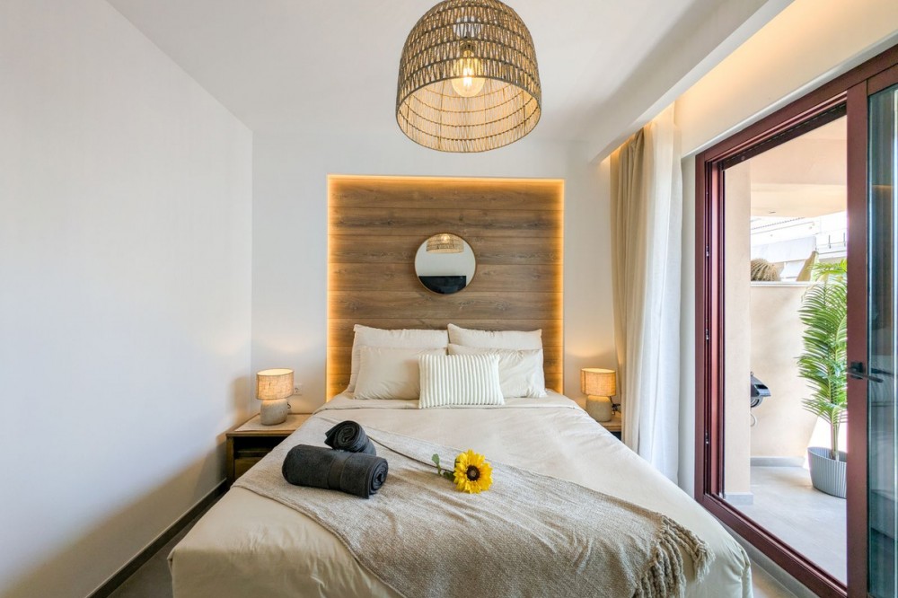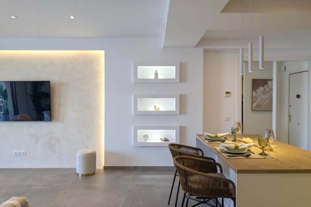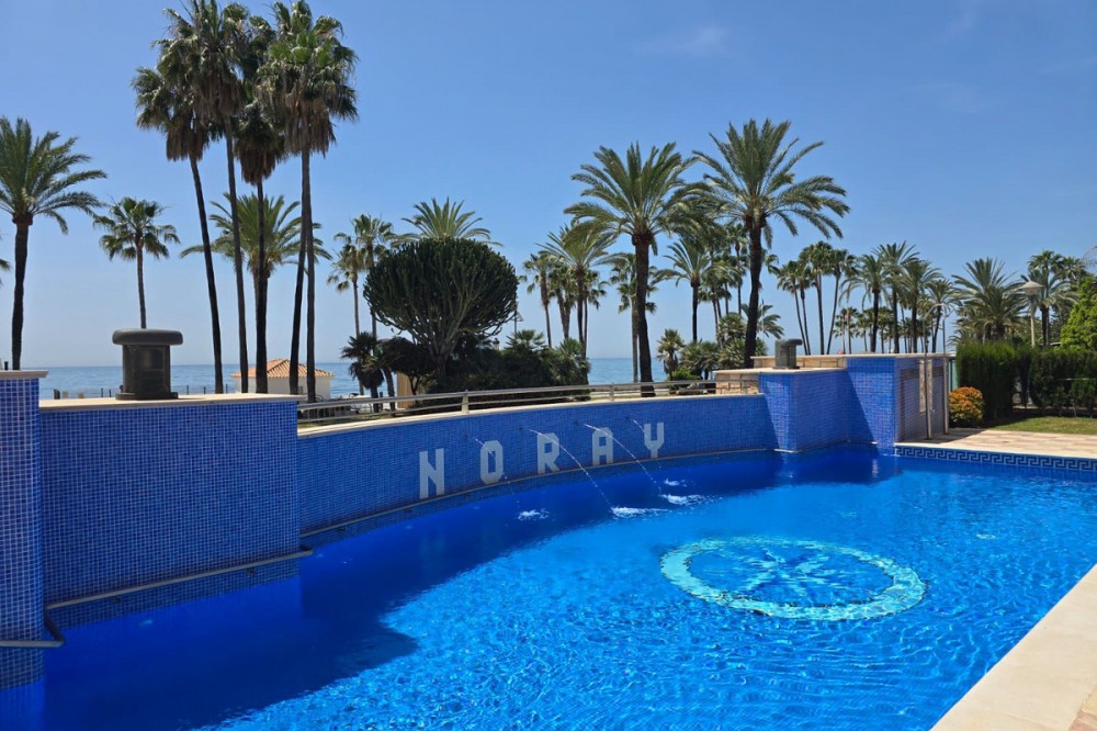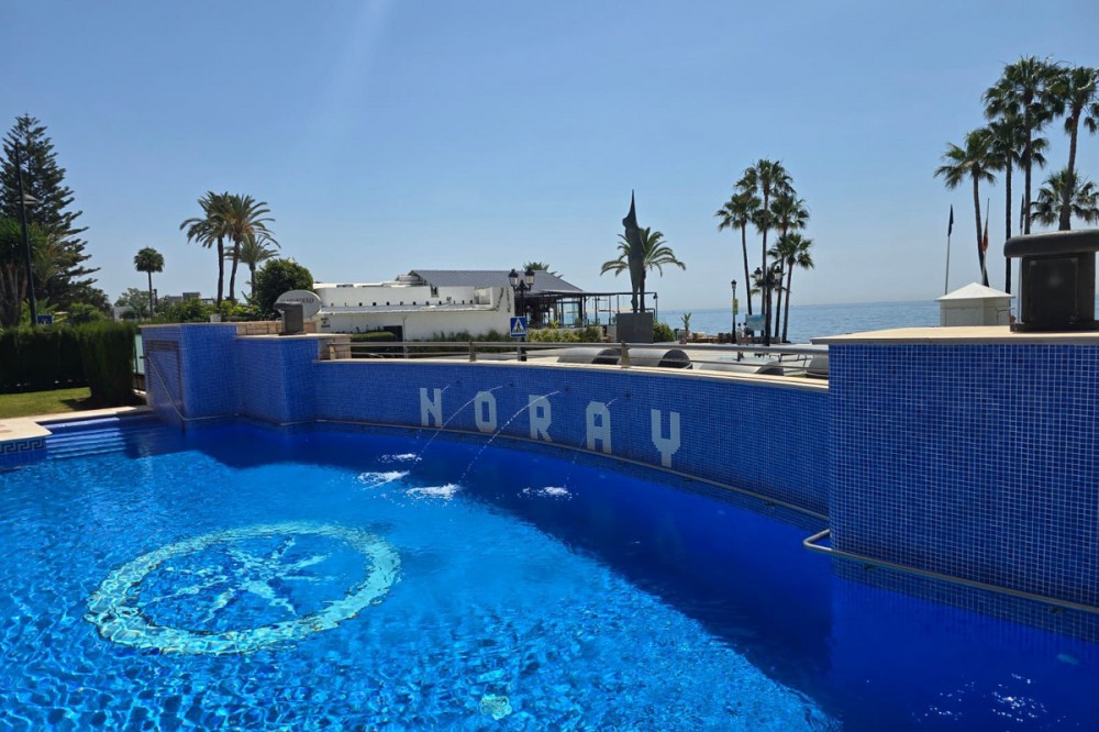 - This luxurious 2 bedroom 2 bathroom apartment located in the prestigious beachfront urbanization in San Pedro has been completely transformed with top-quality renovations, offering a modern and sophisticated living experience. Every aspect of the home has been upgraded, including a brand-new water system and electrical wiring throughout. The kitchen is a chef's dream, featuring sleek, high-end furniture from Germany and the latest Bosch appliances, including a 21-bottle wine cooler, dishwasher for 12, induction cooktop, oven, and microwave. State-of-the-art sensor-activated cabinets add a touch of innovation, while a Philips drinking water filtration system ensures convenience and health. The apartment offers luxurious comfort with heated floors in both bathrooms, and a master switch controls all the lights and outlets, giving you complete control over your space. A central air conditioning system keeps the entire apartment cool, and a built-in safe and digital peephole provide additional security. For ultimate ease, a robotic vacuum cleaner takes care of the floors, and the apartment comes with a two-year warranty on all furniture, appliances, and renovations. This is a rare opportunity to own a fully renovated, high-end property in one of the most sought-after beachfront locations, where modern luxury meets coastal serenity.