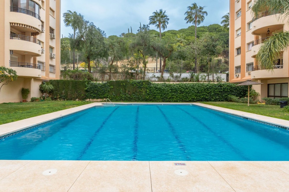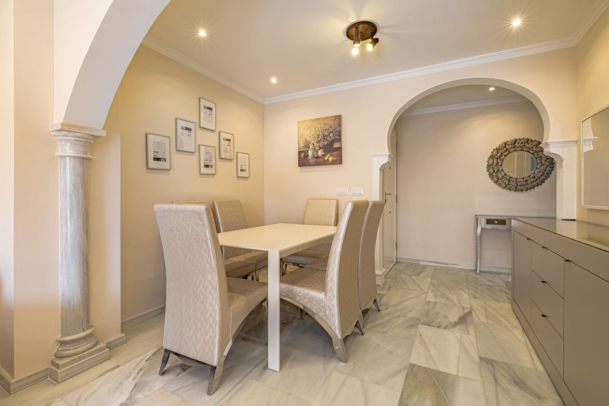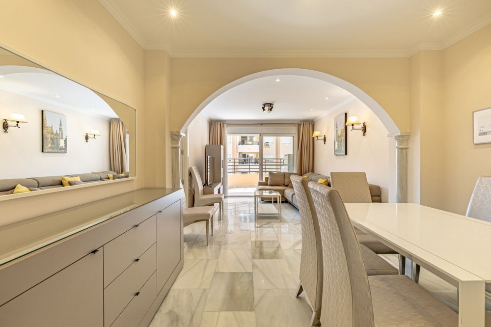 - Impeccable corner apartment on the fifth floor with views of the pool and morning sun. The property has been completely renovated and is ready to move into. It has a living-dining room with access to the terrace, a fully equipped kitchen with a laundry room, a master bedroom with an en-suite bathroom and built-in wardrobes, and two further bedrooms, each with its own bathroom. Being on the corner, the property enjoys plenty of natural light. The car park is communal and enclosed with a gate. The building has a communal garden and swimming pool. Located in the heart of the city, just a stone's throw from Marbella's promenade and the beach.