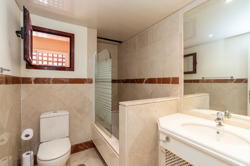 - Ample and bright top floor apartment in Elviria Playa in East Marbella offering three bedrooms, two bathrooms, a glazed and covered terrace, bright living room with access to terrace and a very large fully equipped kitchen with separate laundry room. Equipped with marble floors, AC hot and cold, awning, blinds, underground parking space and storage room. Lift. Complex with three pool areas, a small gym with sauna and within a small walk from the beach and all local amenities.