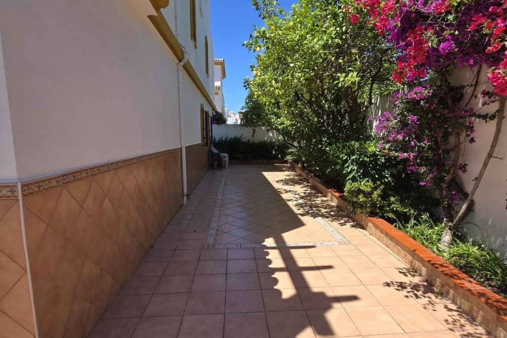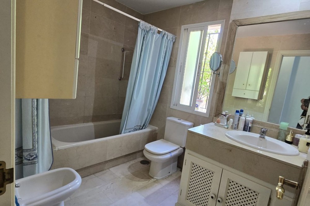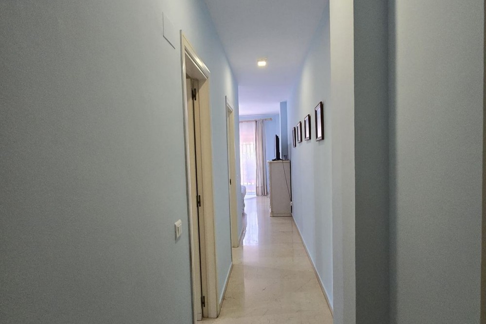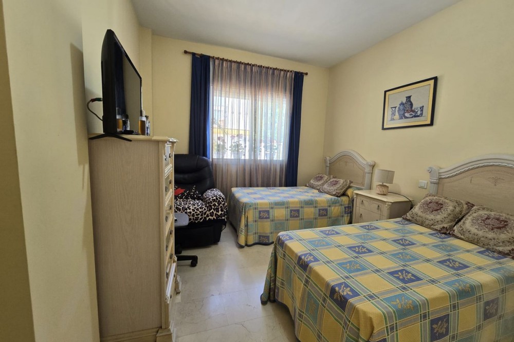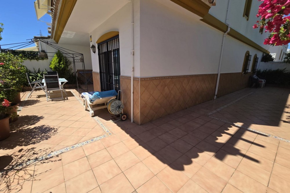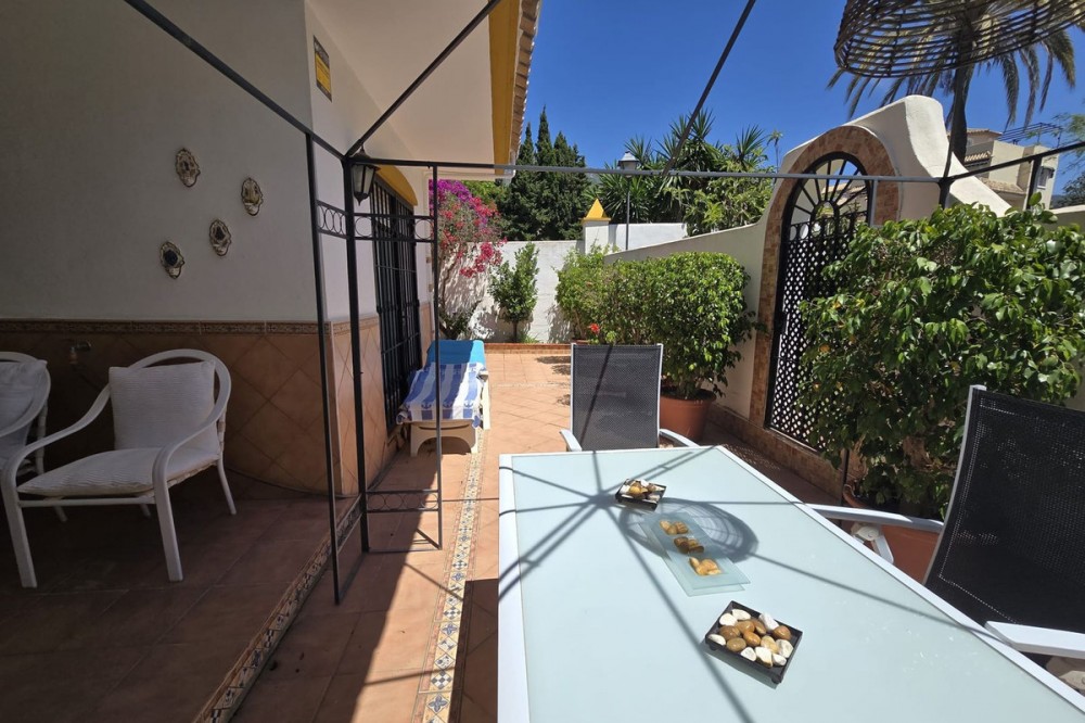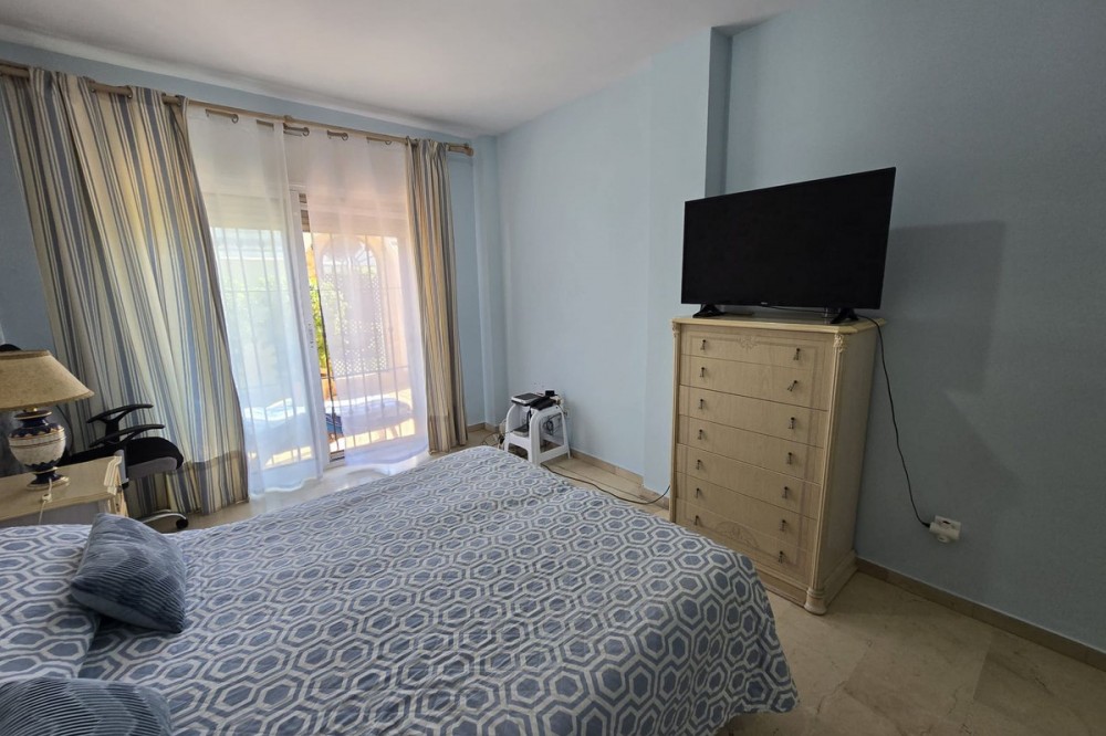 - Ground floor flat for sale in the area of Nagüeles, just a few minutes drive from Puerto Banús and Marbella, in a charming Andalusian village style urbanization, ideal for families as it is close to leading schools such as the Swans International School and the British International School of Marbella, and 2mn drive to the beach of the Golden Mile. The flat has a built area of 135 m2 with a very spacious terrace of 90m2. The property is distributed in an entrance hall, a fully fitted kitchen with utility room, a living-dining room with fireplace, 2 bedrooms with the possibility to make a third bedroom as initially the property was 3 bedrooms, 2 complete bathrooms, one of them ensuite, and a dressing room. It has air conditioning hot and cold, and it is south-east facing. The urbanisation offers many gardens, communal swimming pool and children's playground. It is sold with garage space, no storage room. It has First Occupation Licence.