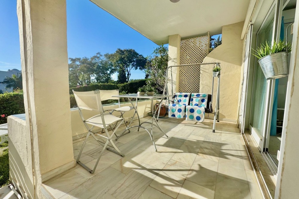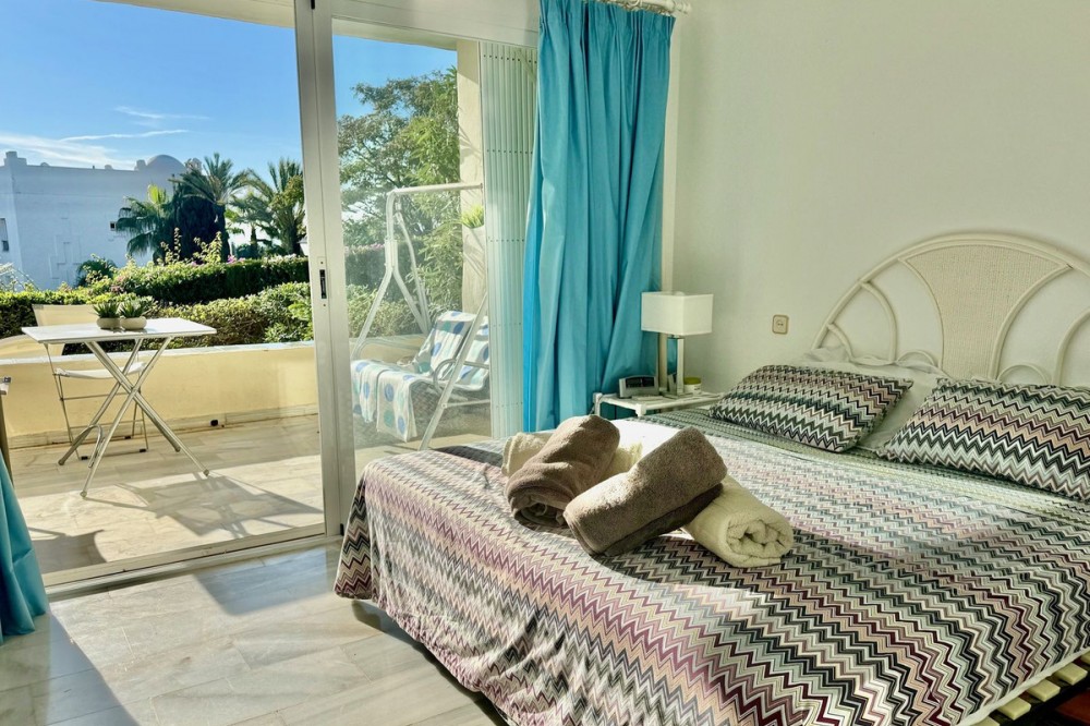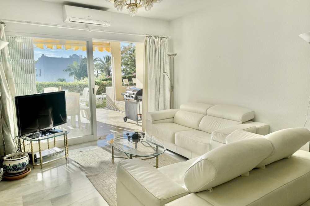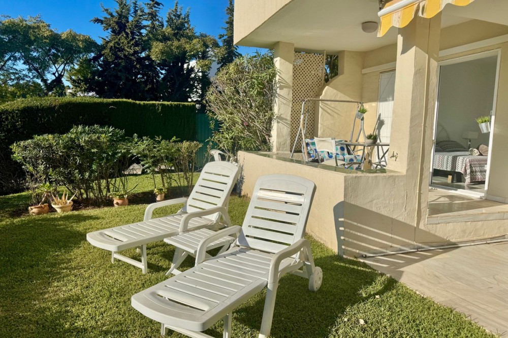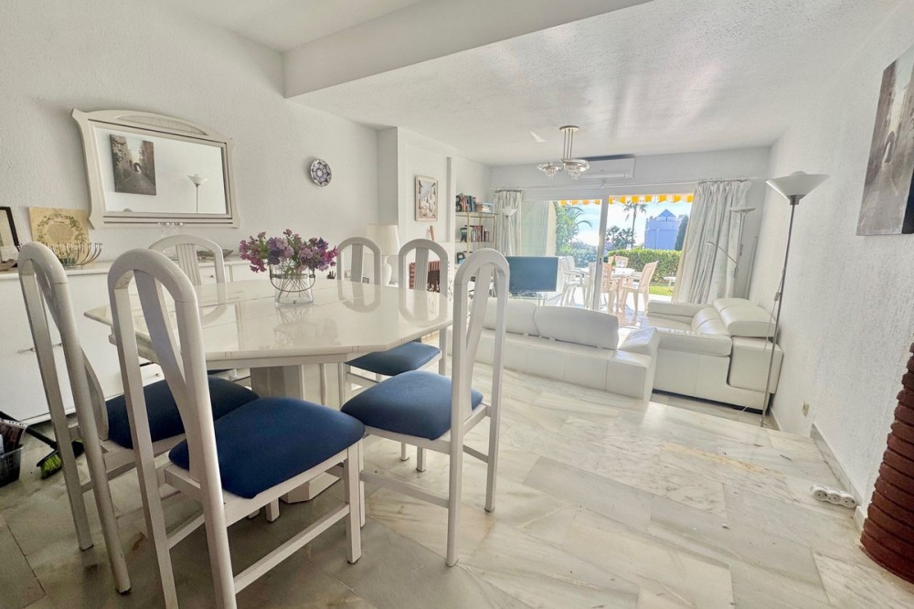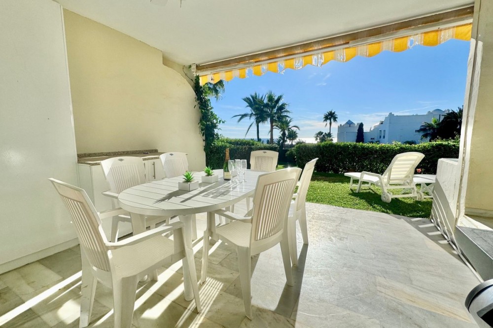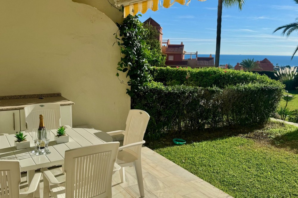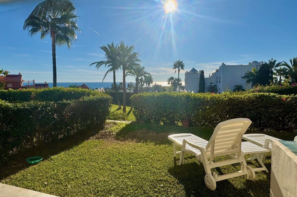 - A fantastic opportunity to own a ground-floor corner apartment in the highly desirable Reserva de Marbella (Las Chapas). Situated within an exclusive gated community of just 18 residences, the complex boasts beautifully landscaped gardens and a large communal pool. The location is ideal—just a short walk to local amenities and a pleasant 25-minute stroll to the picturesque Marbesa beach and the protected Artola dunes. This bright and airy corner apartment offers excellent potential for modernisation and enjoys impressive sea views. A spacious terrace, accessible from both the living room and main bedroom, flows directly into a private garden area, creating a tranquil and secluded outdoor space. Inside, the property features two generous bedrooms and two bathrooms. It comes fully furnished and includes full air conditioning for year-round comfort. A private parking space located just outside the community adds to the convenience.