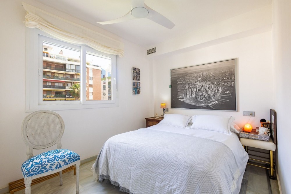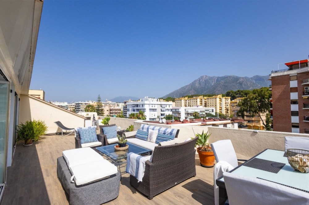 - This bright two-bedroom, one-bathroom apartment is located in one of the best areas of Marbella, just 100 meters from the beach and very close to two of the most iconic landmarks: the prestigious Gran Hotel Don Pepe and the renowned Cappuccino Café. A privileged location surrounded by all essential amenities, including schools, parks, cafés, banks, pharmacies, and hospitals. With 160 m² built area, the property particularly stands out for its impressive 79 m² private upper-floor terrace, currently enclosed with glass, offering multiple possibilities: a chill-out area, outdoor dining space, solarium, or leisure area — a true added value to the home. Situated on the fifth floor, the apartment enjoys an excellent northwest orientation, ensuring abundant natural light throughout the day, as well as partial sea views and spectacular sunsets with the majestic Sierra Blanca mountains as a backdrop. The property also includes a comfortable private parking space. A unique home that combines an exceptional location, spaciousness, natural light, and generous outdoor areas, ideal for enjoying the best Marbella lifestyle or as a secure investment in one of the most sought-after areas.