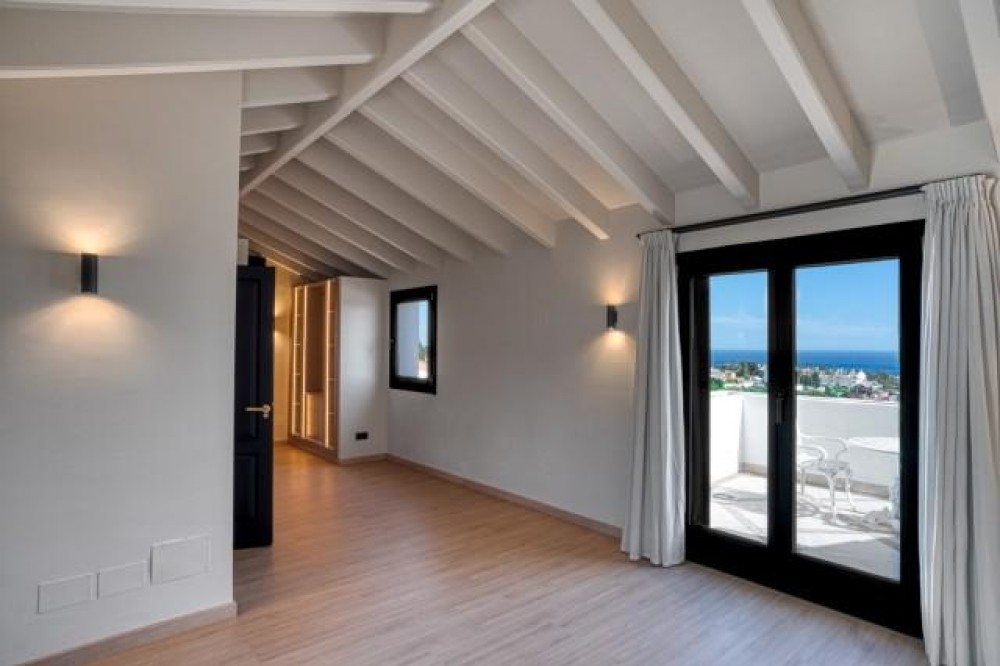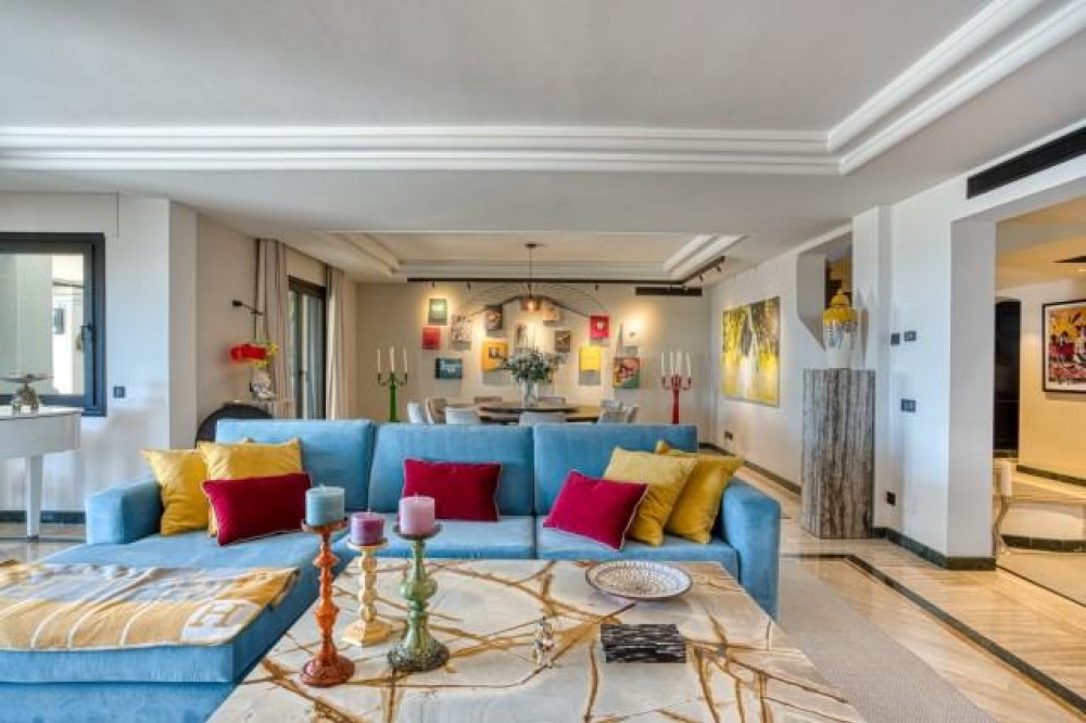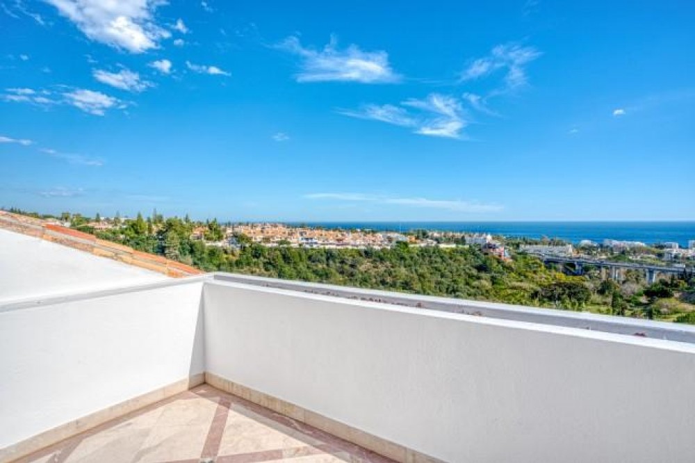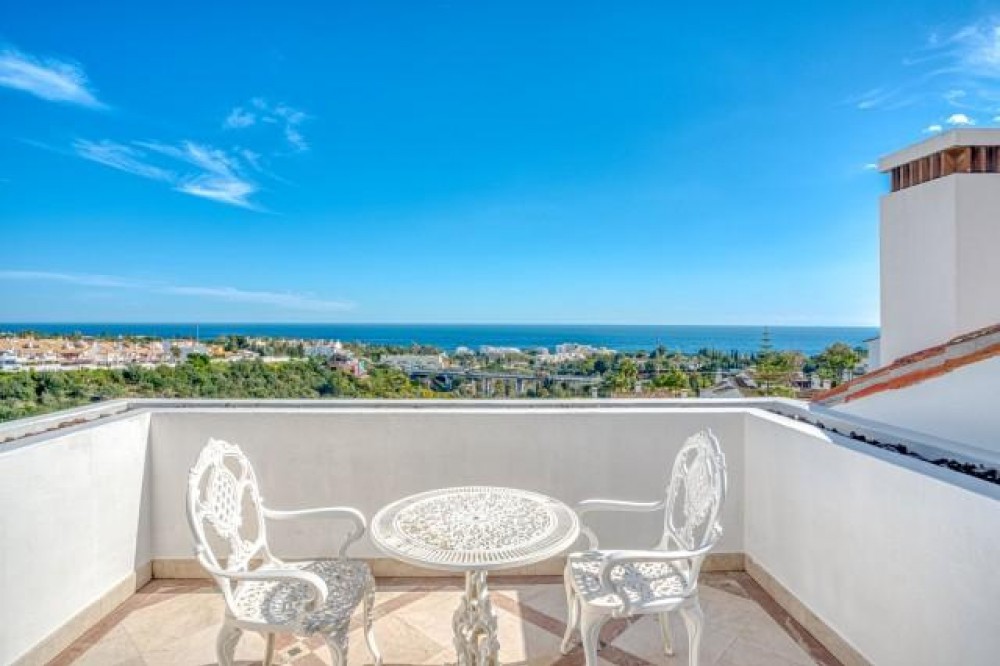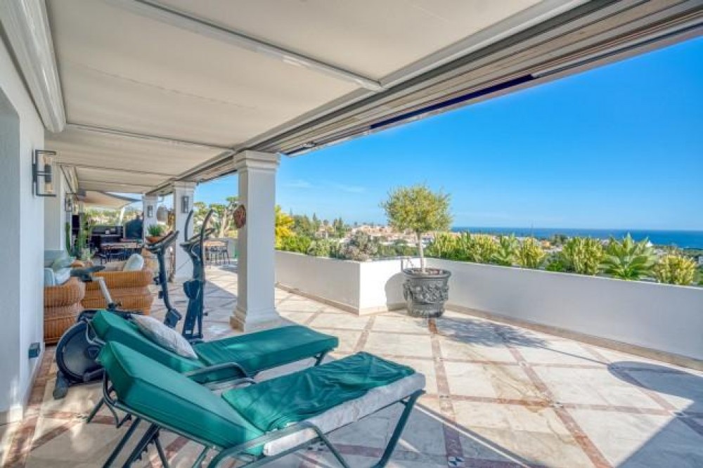 - Spectaculair duplex penthouse met vier slaapkamers en uitzicht op het zuiden in de prestigieuze en afgesloten gemeenschap van Monte Paraiso Country Club, met adembenemend uitzicht op zee en de bergen. Deze gewilde urbanisatie beschikt over 24-uurs beveiliging, drie buitenzwembaden, een lift en prachtig onderhouden tropische tuinen. Het pand verkeert in uitstekende staat en beschikt over een ruime woon- en eetkamer met directe toegang tot een groot privéterras, perfect om te genieten van het prachtige uitzicht. De aparte, volledig uitgeruste keuken heeft een bijkeuken. Alle vier de slaapkamers hebben een eigen badkamer, waarbij de master suite een inloopkast met uitzicht op zee en een luxe badkamer heeft. Daarnaast is er een gastentoilet. Op de bovenste verdieping biedt het penthouse drie uitgestrekte terrassen, ideaal voor buitenentertainment, inclusief een barbecueplek. Een eigen wijnkelder voegt een vleugje exclusiviteit toe. Andere voorzieningen zijn vloerverwarming, airconditioning, marmeren vloeren, een berging en een eigen parkeerplaats voor twee grote voertuigen. Dit is een unieke kans om een luxe penthouse te bezitten in een van de meest exclusieve gemeenschappen van Marbella, op slechts enkele minuten van het strand en het beroemde Puente Romano Hotel. natuurlijk licht