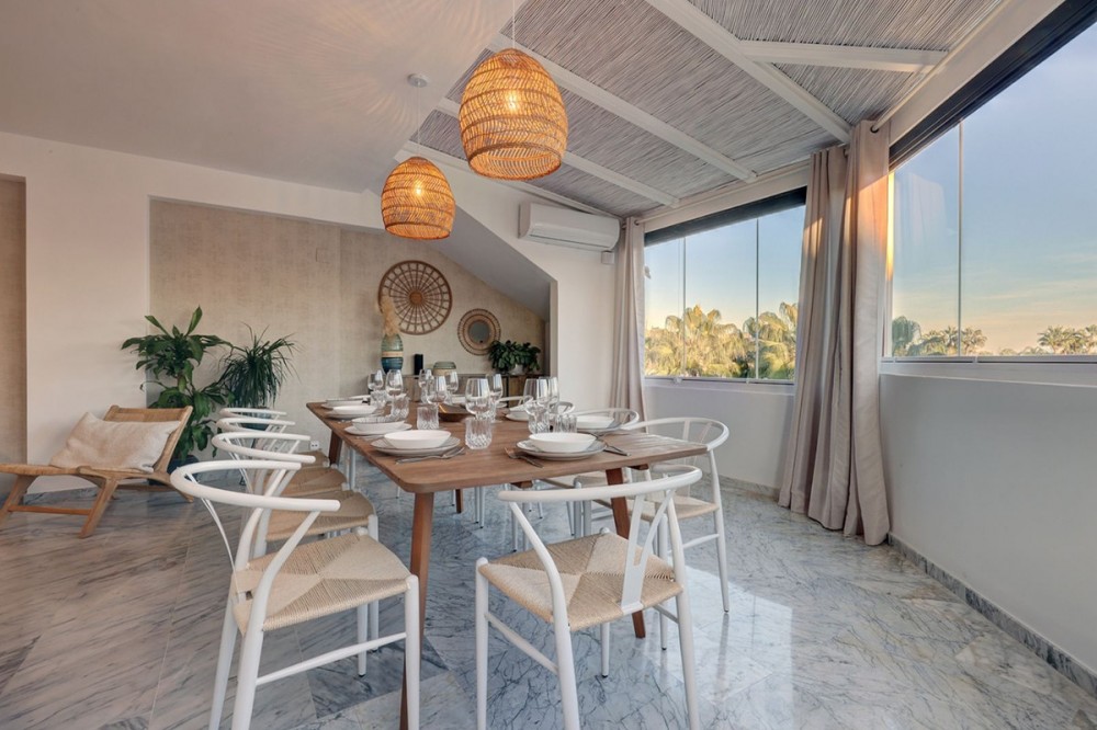 - This amazing recently renovated duplex penthouse is located 5 minutes from MarbellaCenter in a complex 2 minutes walking distance to the sea with stunning gardens, tennis courts and swimming pools. Thanks to the careful design, the apartment is an island of tranquility and peace. It is very comfortable, spacious and fully equipped with everything you might need on holiday. It is ideal if you are travelling with family or friends and looking to escape the winter to the beautiful Costa del Sol. Comprising 4 bedrooms and 2 bathrooms over 2 levels. The lower floor offers a very spacious living area, as the terrace has been closed in to create more space. However, there is a concertina window system that can be completely opened up to recreate a terrace ambiance. The upper floor houses a Master bedroom with ensuite bathroom and another guest bedroom. There is also another small room on this level that can be used as an office or laundry room. Sold with underground parking and storage room. This is one of the nicest residential areas in Marbella and is also well-known as having the best beaches as well.