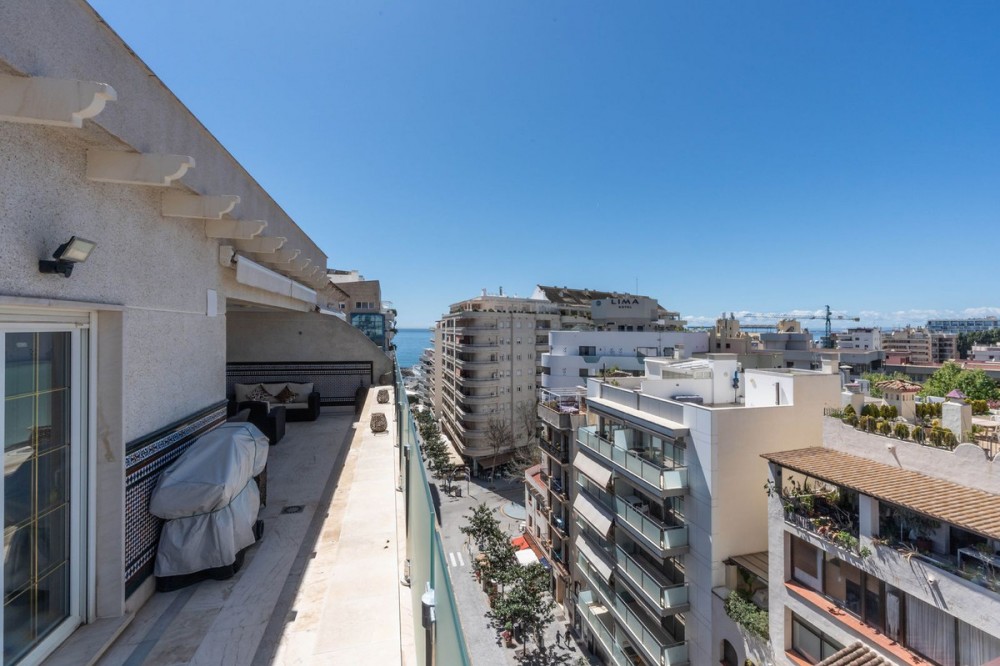- This is a stunning duplex penthouse with sea views situated right in the heart of Marbella, less than 200m from the sea. Set just behind Cafe Marbella and the Alameda Park, it is in a fabulous location with both sea and mountain views and numerous cafes, restaurants and shops on your doorstep. This spacious and beautifully maintained property was originally built for the developer and offers many extra features and upgrades not seen in any of the other apartments in the building. The first floor has a large open plan lounge/diner with a working log burner and large patio doors leading out to the wrap around terrace. There is a spacious, fully equipped kitchen adjacent to the outside, covered seating and dining area and also a utility room. On this level there is also a large bathroom beside a separate dining room which could easily be converted back to a 5th bedroom, ideal for an elderly relative or staff. Upstairs there are 4 bedrooms. The large master bedroom has a fireplace, dressing area and an en-suite bathroom with a jacuzzi bath. There are 2 other bedrooms with en-suite bathrooms and a smaller guest room. Outside there are 2 large solarium terraces ideal for a hot tub, sunbeds and enjoying the sun or sitting out in the evening admiring the views. There is a private underground garage with space for 2 cars which has electricity and extra space for storage.