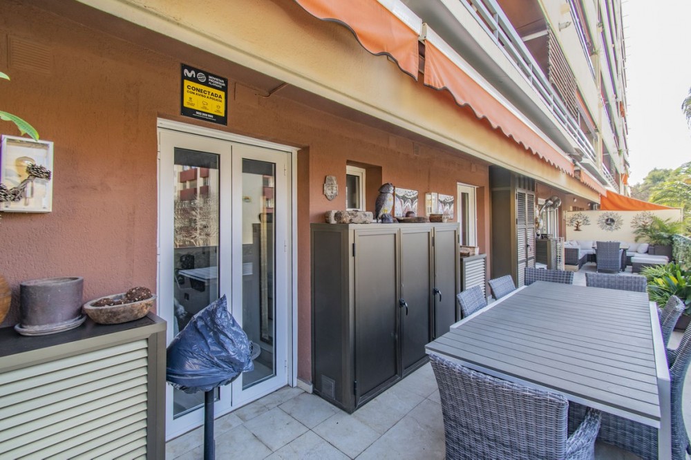 - LARGE PROPERTY 200 METERS FROM THE BEACH IN THE CENTER OF MARBELLA Fantastic large property, with a privileged location in the center of Marbella, 200 meters from the promenade and the beach, surrounded by all kinds of services (restaurants, supermarkets, banks, pharmacies...etc) and just a few minutes walk from the Old Town. Large renovated property consisting of a total of three bedrooms, three bathrooms, large living room with open plan and large terrace of more than 70m2. Established within an emblematic building with gardens and communal pool. Includes parking space. An ideal property for clients who want to enjoy a property in the center of Marbella ready to move into.
