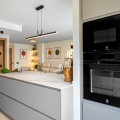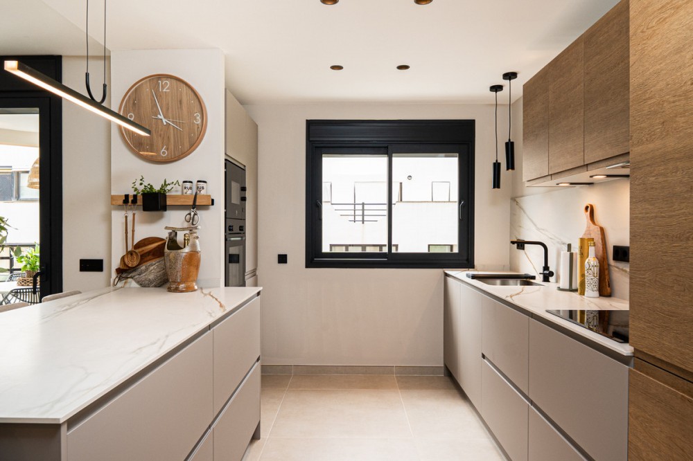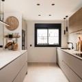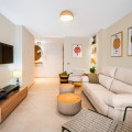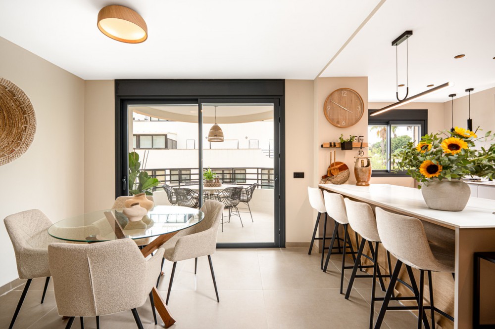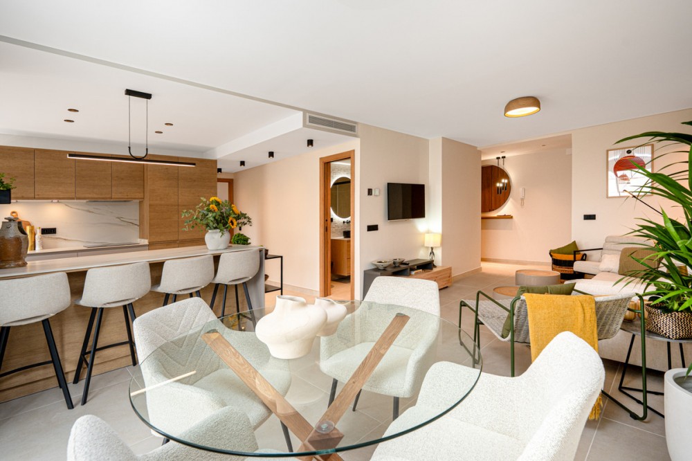 - Situated in one of the most picturesque parts of Marbella, this newly refurbished three-bedroom, three-bathroom apartment has been finished to the very highest standards. Modern yet understatedly elegant, it offers a perfect blend of comfort, functionality, and style. Located within a secure private building with a gated entrance and wheelchair accessibility, and within walking distances to Marbellas finest beaches, the apartment is built over 114 m² and enjoys a westerly orientation. Its position ensures abundant natural light throughout the day, highlighting the quality of the finishes and the thoughtful design in every corner. The open-plan layout allows the kitchen to flow seamlessly into the living and dining areas, creating a spacious and inviting environment. The interior design combines neutral-toned floor tiles with clever touches of wood and soft furnishings, producing an atmosphere of tranquility and sophistication. The kitchen is a highlight, equipped with first-class appliances, deep cupboards, and generous worktop space. A stylish breakfast bar offers an alternative to the dining table, providing a more informal yet elegant dining option. From all main living spaces, sliding doors open onto the terrace, where a dining table sets the scene for alfresco meals or evening drinks in the Marbella sunshine. Each of the bedrooms has been carefully designed to maximize both light and space. Fully fitted wardrobes ensure ample storage, while two of the three bedrooms benefit from their own private ensuite bathrooms. All three bathrooms are exceptionally crafted, featuring walk-in rain showers behind floor-to-ceiling glass partitions, sleek fixtures, and warm wooden accents. The neutral palette enhances the spa-like feel, creating a serene environment for relaxation. The property forms part of a beautifully maintained community, offering residents access to a swimming pool and landscaped gardens. A large communal parking area is reserved for owners, ensuring convenience, while there is also the option to purchase a private underground parking space for an additional €25,000. Further features include central air conditioning throughout and underfloor heating in all three bathrooms, adding an extra layer of luxury and comfort. Perfectly located, this apartment is just minutes from Marbella’s renowned beachfront promenade, which stretches all the way to San Pedro. Shops, first-class restaurants, lively bars, and charming beachside chiringuitos are all within walking distance, making this property not only a beautiful home but also an exceptional lifestyle opportunity. Stylish, modern, and superbly located, it represents a rare chance to own a dazzling apartment in the captivating town of Marbella.