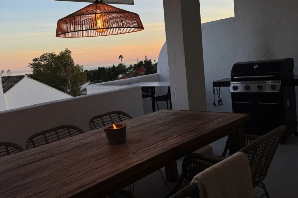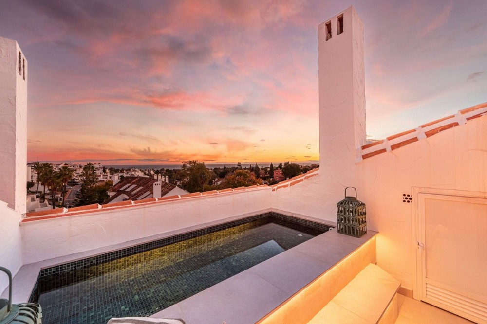 - Luxurious Duplex Penthouse in Exclusive El Dorado, Nueva Andalucía – Stunning Sea Views, Private Plunge Pool, and Prime Location! Elevate your lifestyle in this exquisite duplex penthouse, nestled in the highly sought-after El Dorado urbanization in Nueva Andalucía – a true epitome of modern Scandinavian elegance and comfort. Spanning 135 m² across two floors on the 3rd level, this fully furnished property boasts 3 bedrooms and 3 bathrooms, designed for seamless luxury living with a proven rental track record, including a valid First Occupation License (LPO) and active tourist license. The main floor features a bright open-concept kitchen equipped with top-of-the-line appliances, flowing effortlessly into a spacious living area that opens onto a south-facing terrace. This outdoor haven includes a dining table, high bar, and barbecue zone, all overlooking the expansive communal pool. The upper floor is equally captivating, with two en-suite bedrooms: the master suite complete with a walk-in closet and access to a private terrace featuring a heated plunge pool and breathtaking panoramic sea views. The second bedroom offers a west-facing terrace with serene mountain vistas, perfect for afternoon unwinding. Key Features: Outdoor Excellence: Three terraces (two south-facing and one west-facing) for sun-soaked relaxation, plus lush communal gardens and a large swimming pool. Secure and Convenient: Gated community with security, two underground parking spaces, and low community fees. Contemporary Furnishings: Fully equipped in a sleek modern style, ready for immediate occupancy or high-yield rentals. Unbeatable Location: Steps from Centro Plaza's restaurants, supermarkets, and shops; close to the beach and glamorous Puerto Banús, blending convenience with exclusivity. This duplex penthouse isn't just a home – it's a savvy investment in luxury, functionality, and profitability on the Costa del Sol. Contact us today to arrange a viewing and secure this exceptional opportunity!