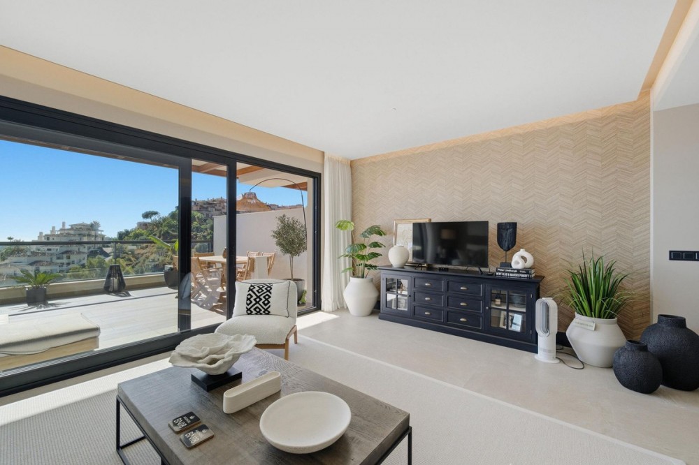 - Elegant Apartment in Marbella Lake – Sea Views, 24/7 Security & Rental License Welcome to Marbella Lake, one of Marbella’s most desirable modern complexes. This stunning 2-bedroom, 2-bathroom apartment offers contemporary elegance and Mediterranean comfort — fully furnished with high-quality furniture, ready to move in. The spacious open-plan living area opens onto a sunny terrace with beautiful sea and mountain views, creating the perfect setting for relaxation or entertaining. Residents enjoy 24/7 upgraded security, lush communal gardens, and inviting swimming pools, all designed for peace and comfort. The property also includes a private underground parking space and a storage room for added convenience. This apartment comes with a tourist rental license, making it ideal for investors seeking strong rental potential. An excellent choice for those seeking a turnkey home or investment in one of Marbella’s most sought-after gated communities — just minutes from golf courses, beaches, and Puerto Banús.