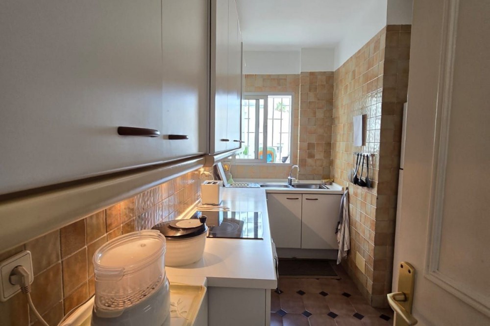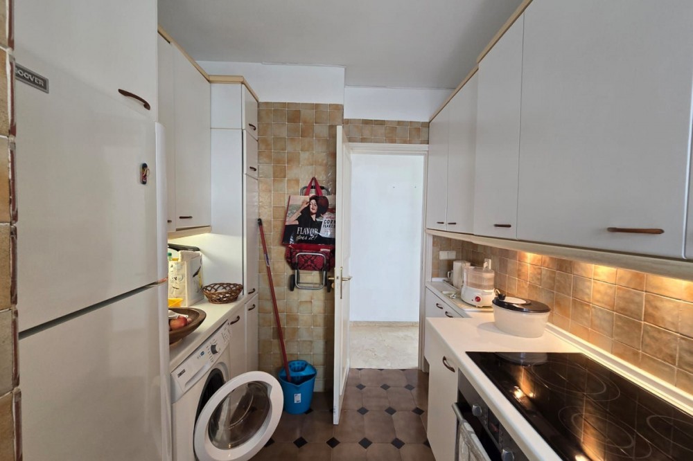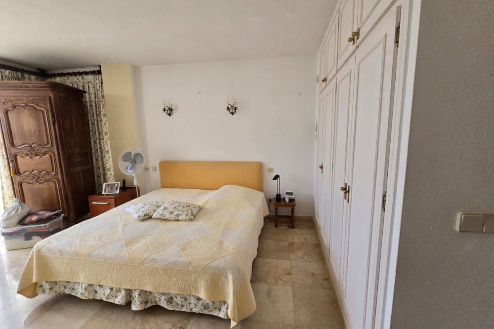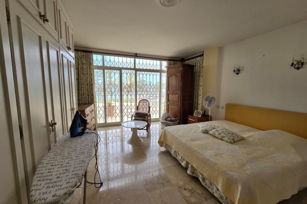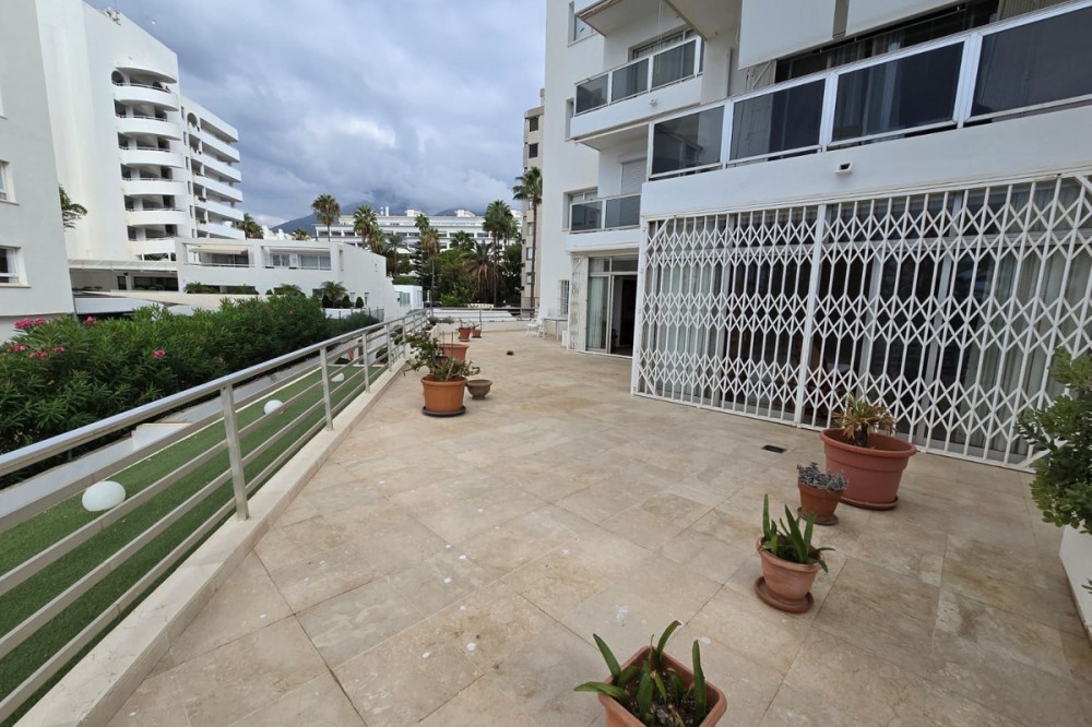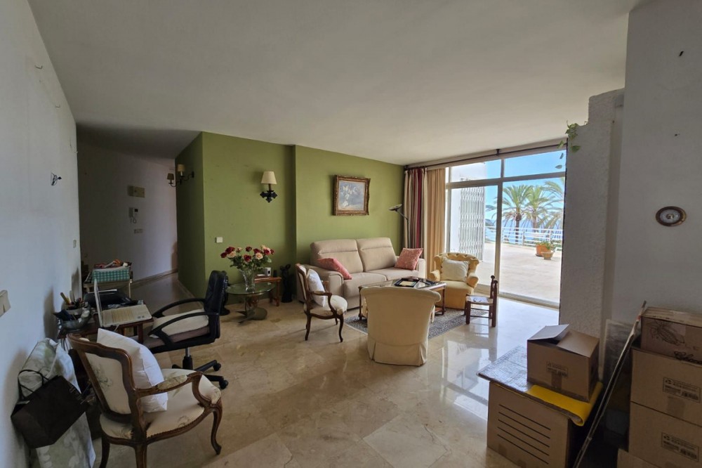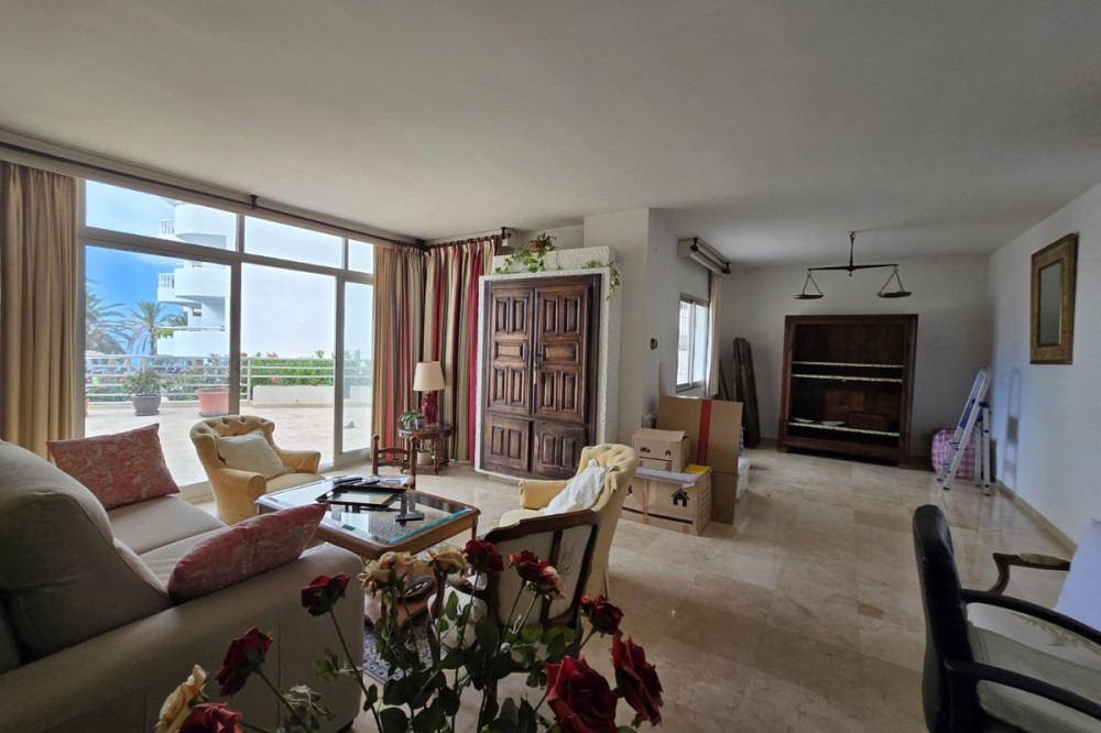 - OPPORTUNITY IN MARBELLA FIRST LINE BEACH Ground floor flat for sale The 90m² flat with over 100m² of terrace enjoys sea and pool views. It is part of two apartments joined together and currently consists of a spacious bedroom with plenty of cupboards, a living-dining room, a fitted kitchen and a full bathroom. It offers many possibilities and could be converted into two bedrooms. It has marble flooring and direct access to the terrace from the bedroom and living room. It is sold unfurnished with a parking space and a large storage room. The development offers a concierge, lift, swimming pool and direct access to the beach.